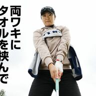 そのとき、どんなことを意識しているのか。「両腕を上から胸を押さえつけるように、タオルを挟むと上体が力みやすく、手打ちにつながる。なので、両腕は下から回すようにしてワキを締めると、ヘッドの重さを感じながら打てます」。
